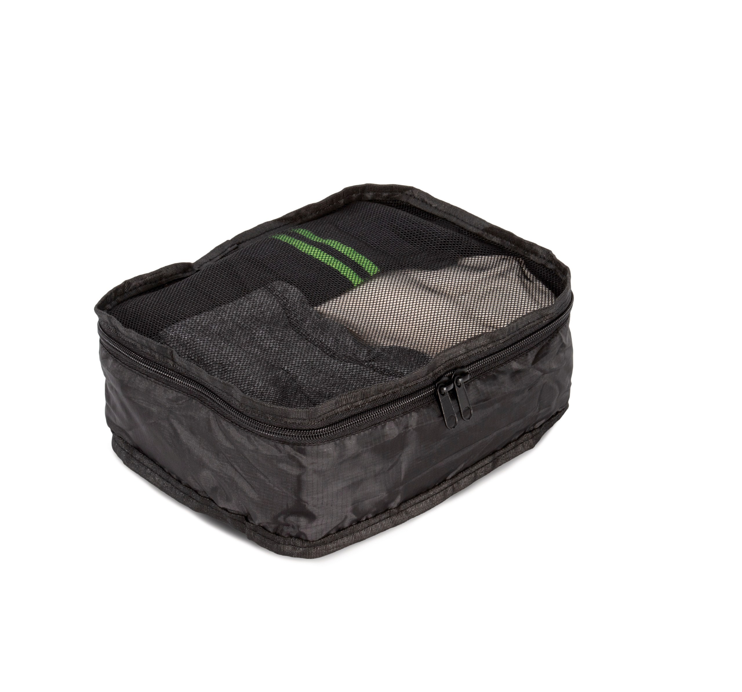 100 % polyester. Housse de rangement organisateur de bagage en Polyester 190 TPU Ripstop. Idéal pour les sous-vêtements et les accessoires. Panneau supérieur en filet. Se replie sur lui-même et se range dans un petit sac ultra pratique. Anneau pour l’accrocher à tout type de mousqueton. Petit format.