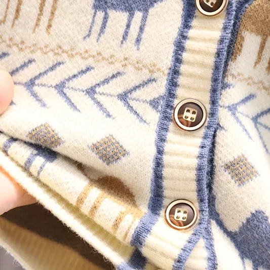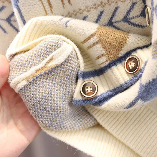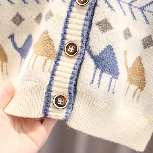 Vous recherchez un joli gilet intemporel pour votre petit garçon ? Optez pour ce très beau modèle beige col V imprimé de jolis petits chameaux. Chaud, doux et réconfortant, il plaira à coup sûr à votre petit garçon. Facile à assortir, votre enfant pourra le porter tout au long de la saison froide !