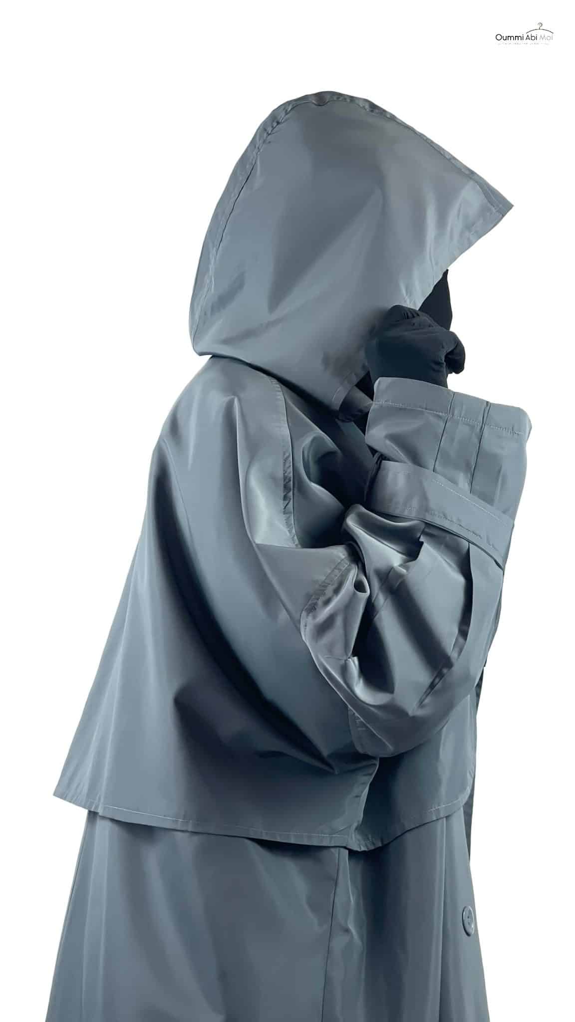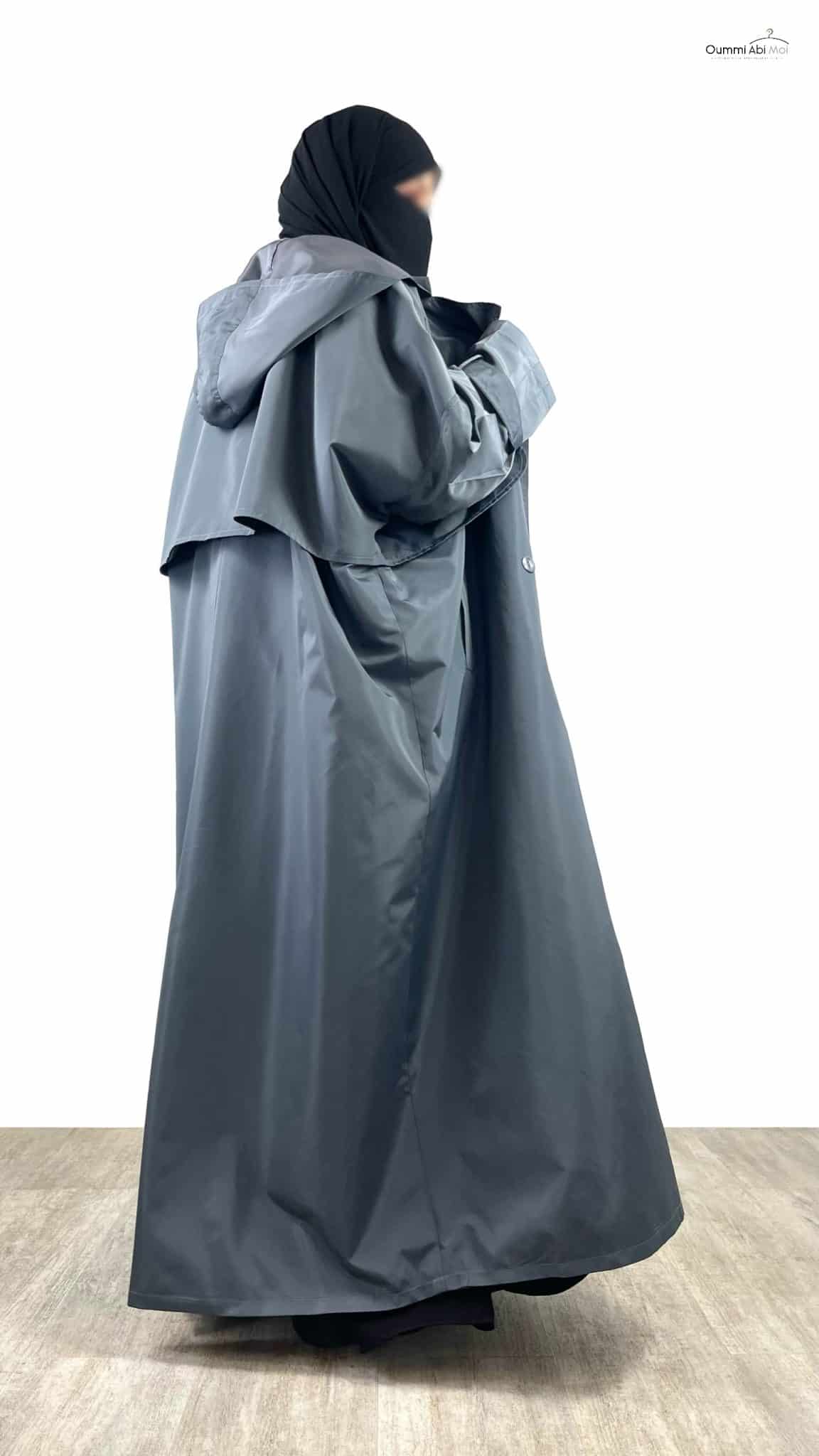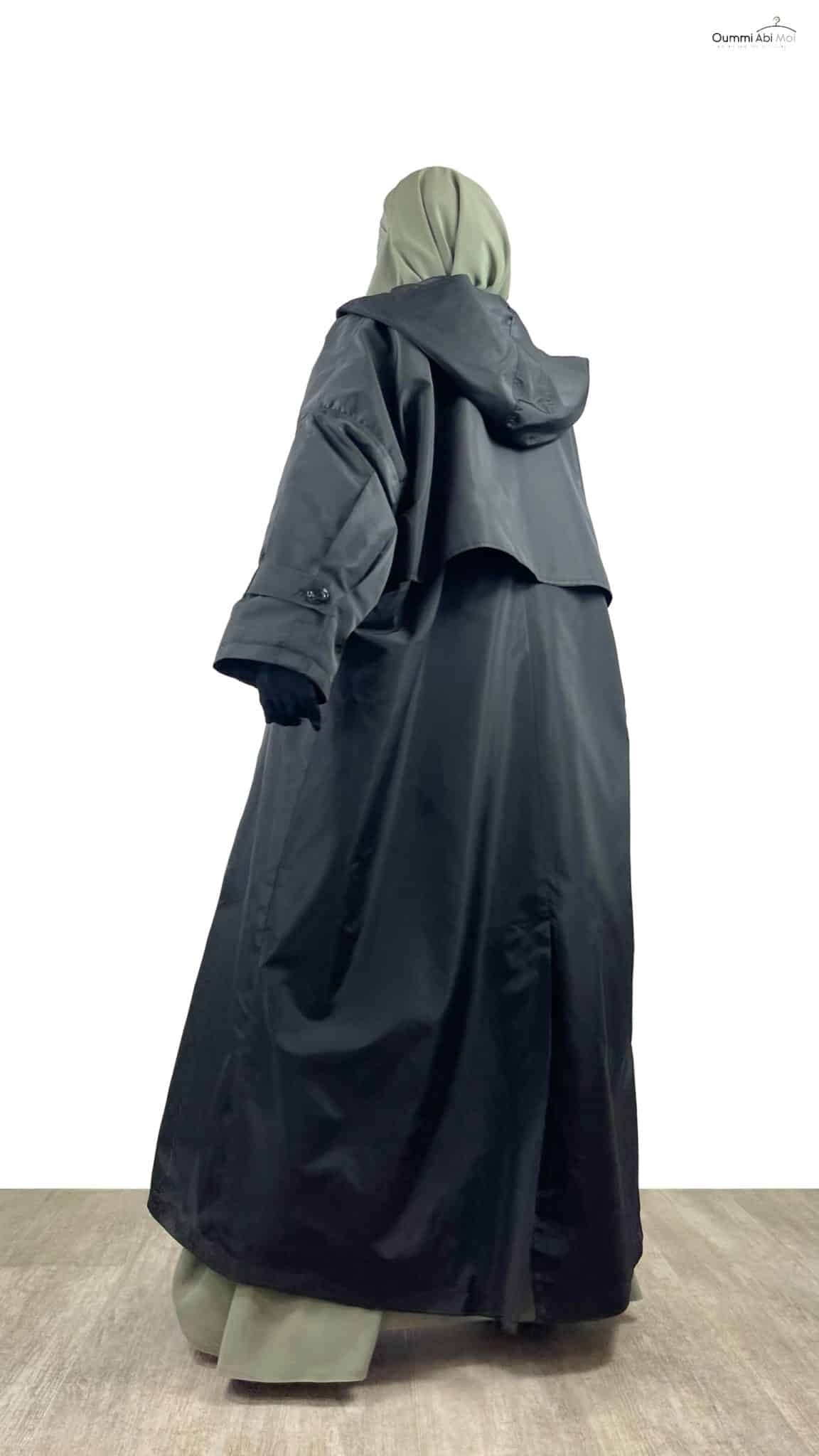Il est doté de 6 boutons permettant de le porter aussi bien ouvert que fermé. Une capuche très large a été disposée de telle sorte qu’elle cache les épaules. Vous pouvez porter cette veste par dessus votre Khimar ou Hijab. Il possède aussi une fente d’environ 45cm de longueur à l’arrière.