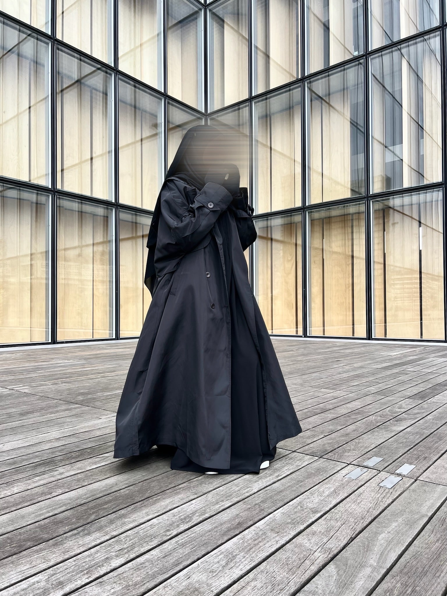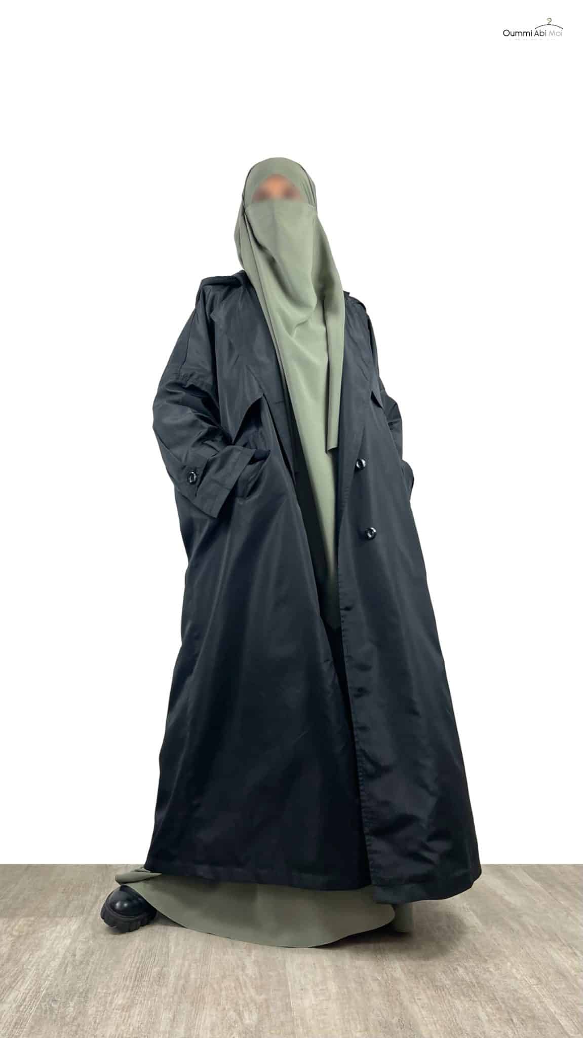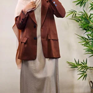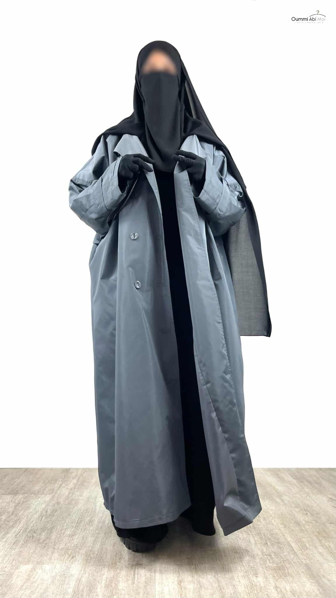 Il est doté de 6 boutons permettant de le porter aussi bien ouvert que fermé. Une capuche très large a été disposée de telle sorte qu’elle cache les épaules. Vous pouvez porter cette veste par dessus votre Khimar ou Hijab. Il possède aussi une fente d’environ 45cm de longueur à l’arrière.