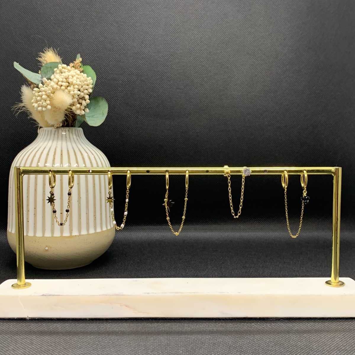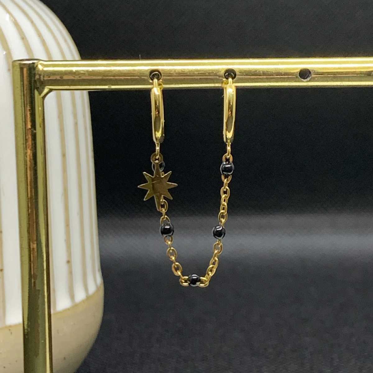 La mono-boucle diams se compose de deux anneaux dorés et d’un pendant étoile, le tout relié par une jolie chaine dorée avec des jolies perles noires.