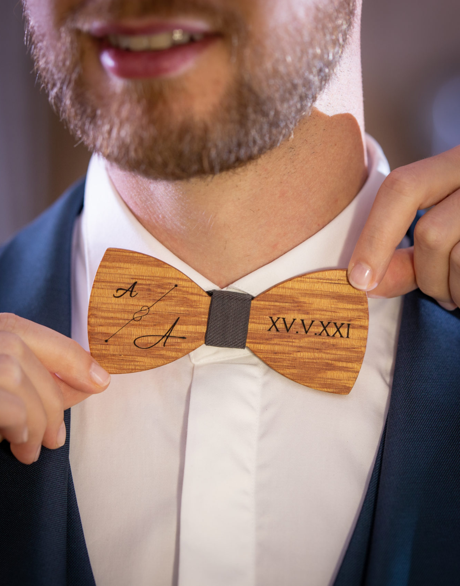 Apportez une touche d’originalité et de naturel à votre tenue avec notre nœud papillon en bois personnalisable. Parfait pour les mariés, témoins, et invités désirant se démarquer.