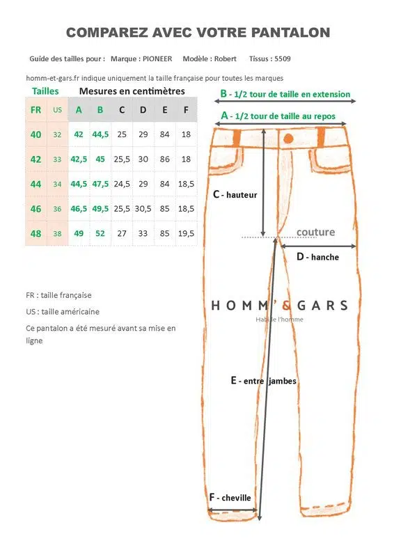 Ce pantalon est en coupe Enzo, un peu plus étroite au niveau largeur de cuisses et chevilles que le modèle Robert