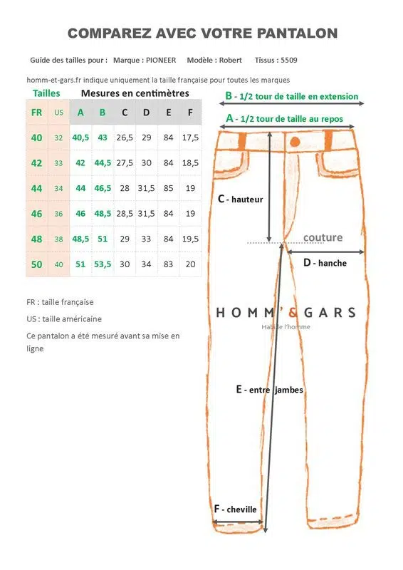 Ce pantalon est le modèle Robert, la coupe la plus large au niveau des cuisses chez Pioneer.