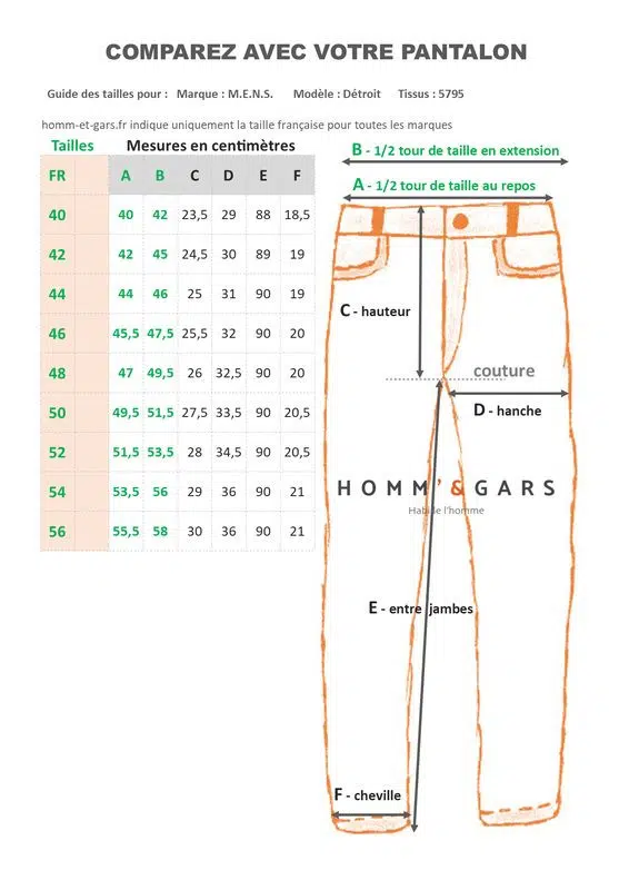 Guide des tailles sur la dernière photo afin de comparer les mesures avec votre propre pantalon