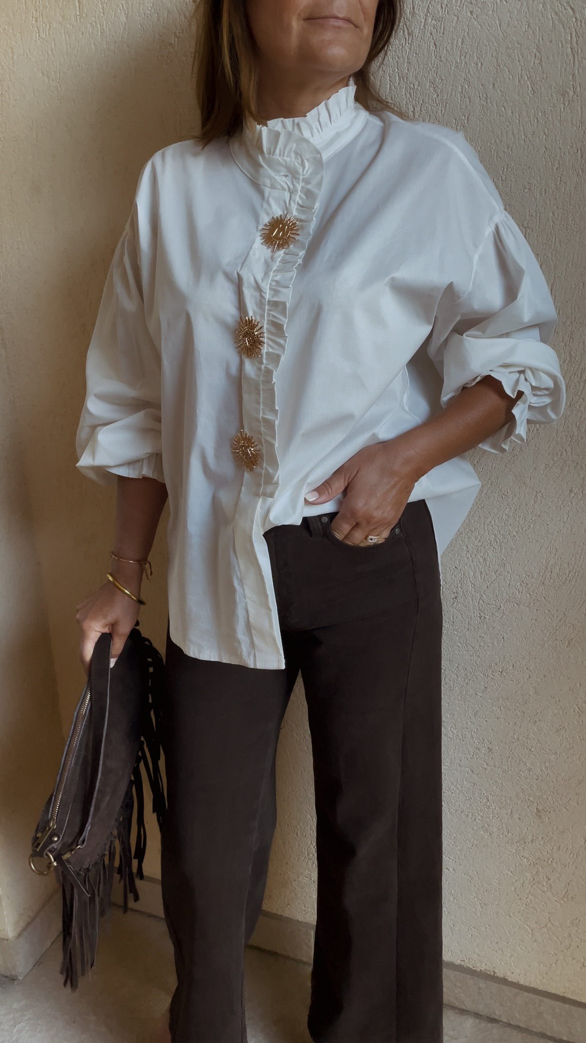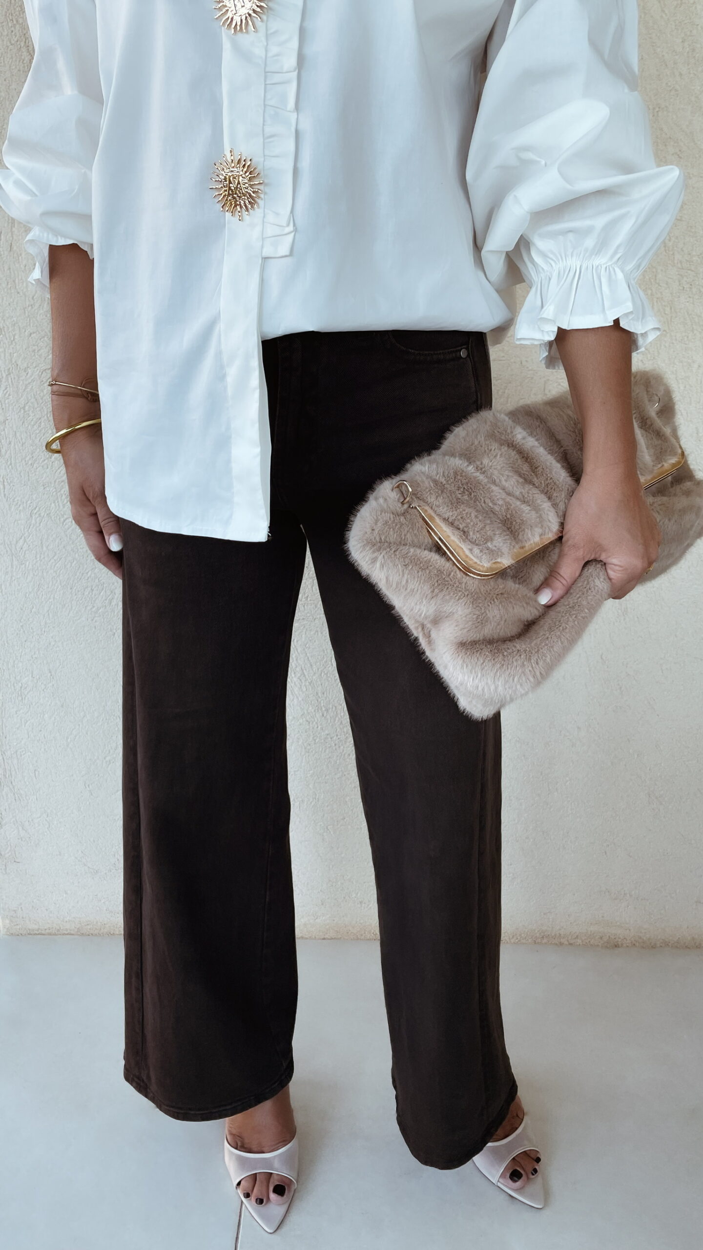 -Pantalon marron coupe jeans taille haute et bas évasé.