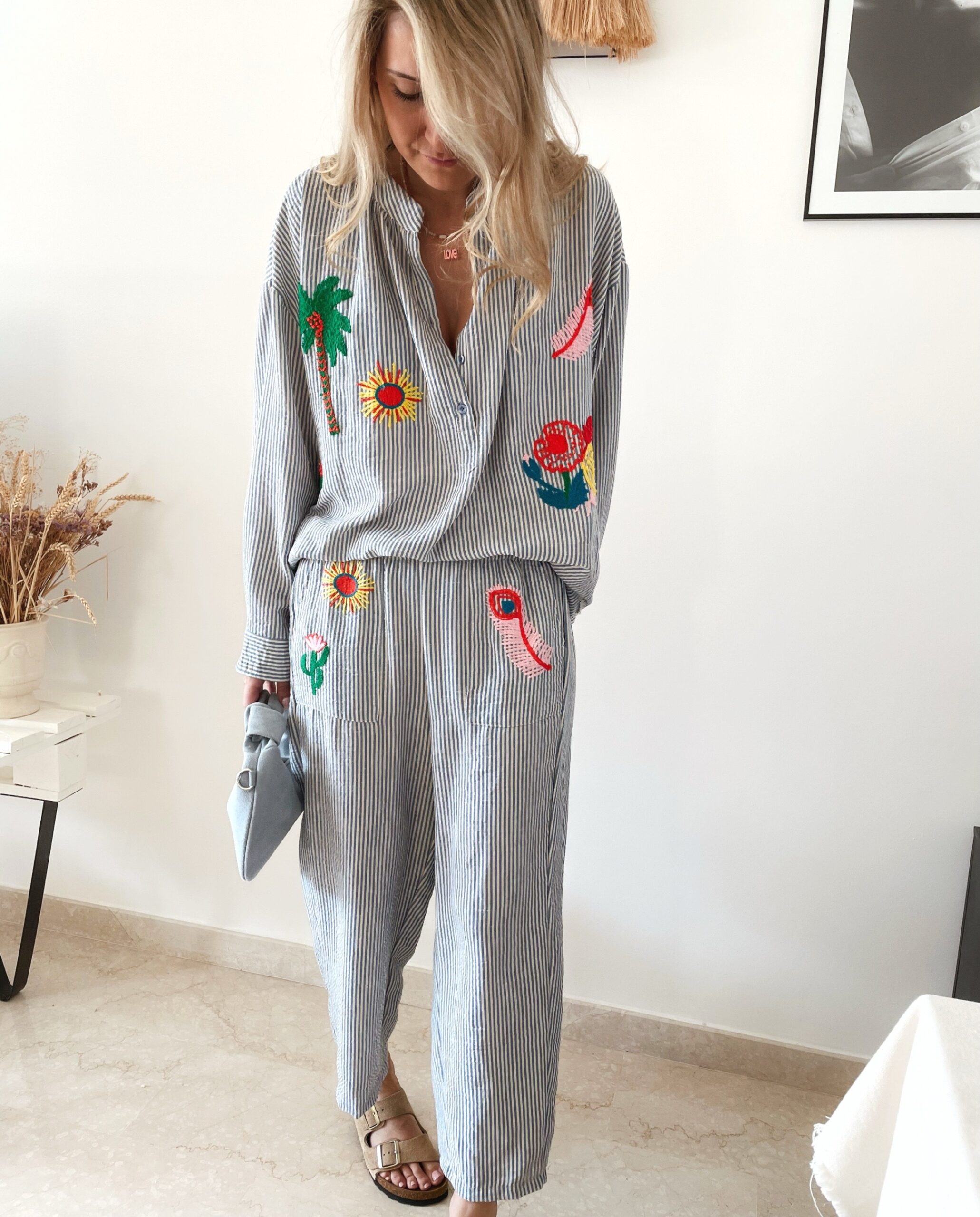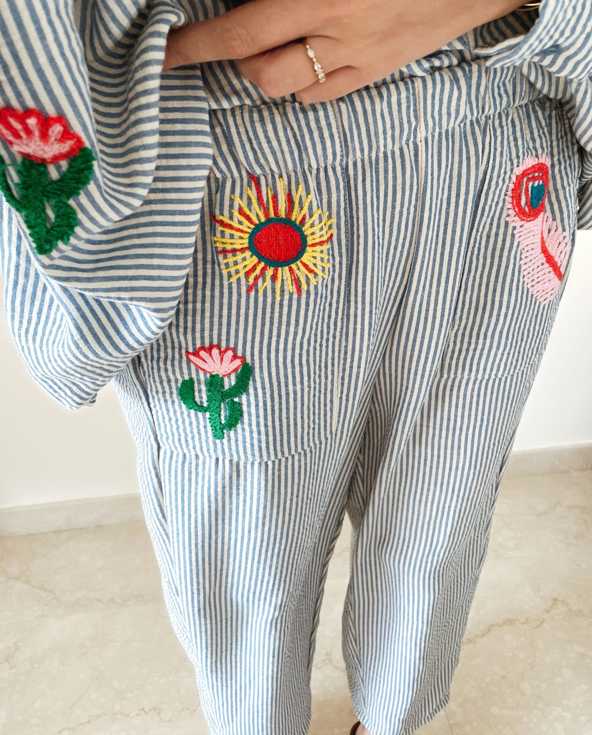 Pantalon rayé bleu et blanc avec broderies colorées sur les poches avant.