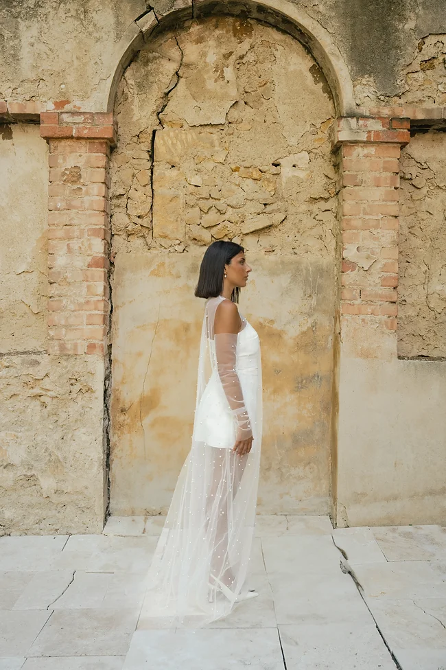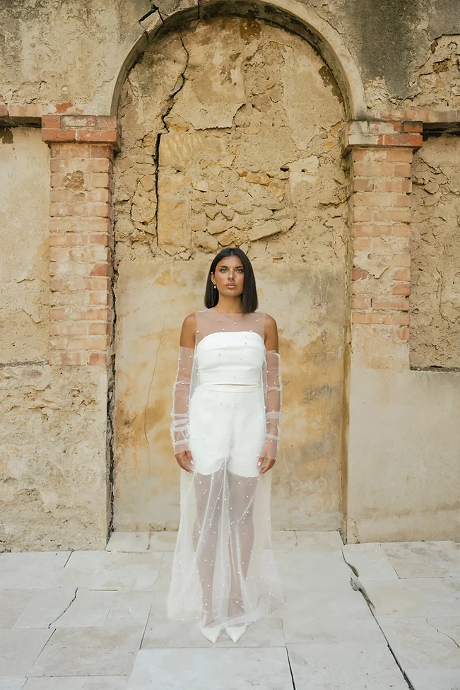 L’incontournable combinaison de mariée ‘Perle’ peut se voir compléter par le ‘Par-dessus Perle’ en tulle perlé, avec sa traine et sa fente milieu dos.