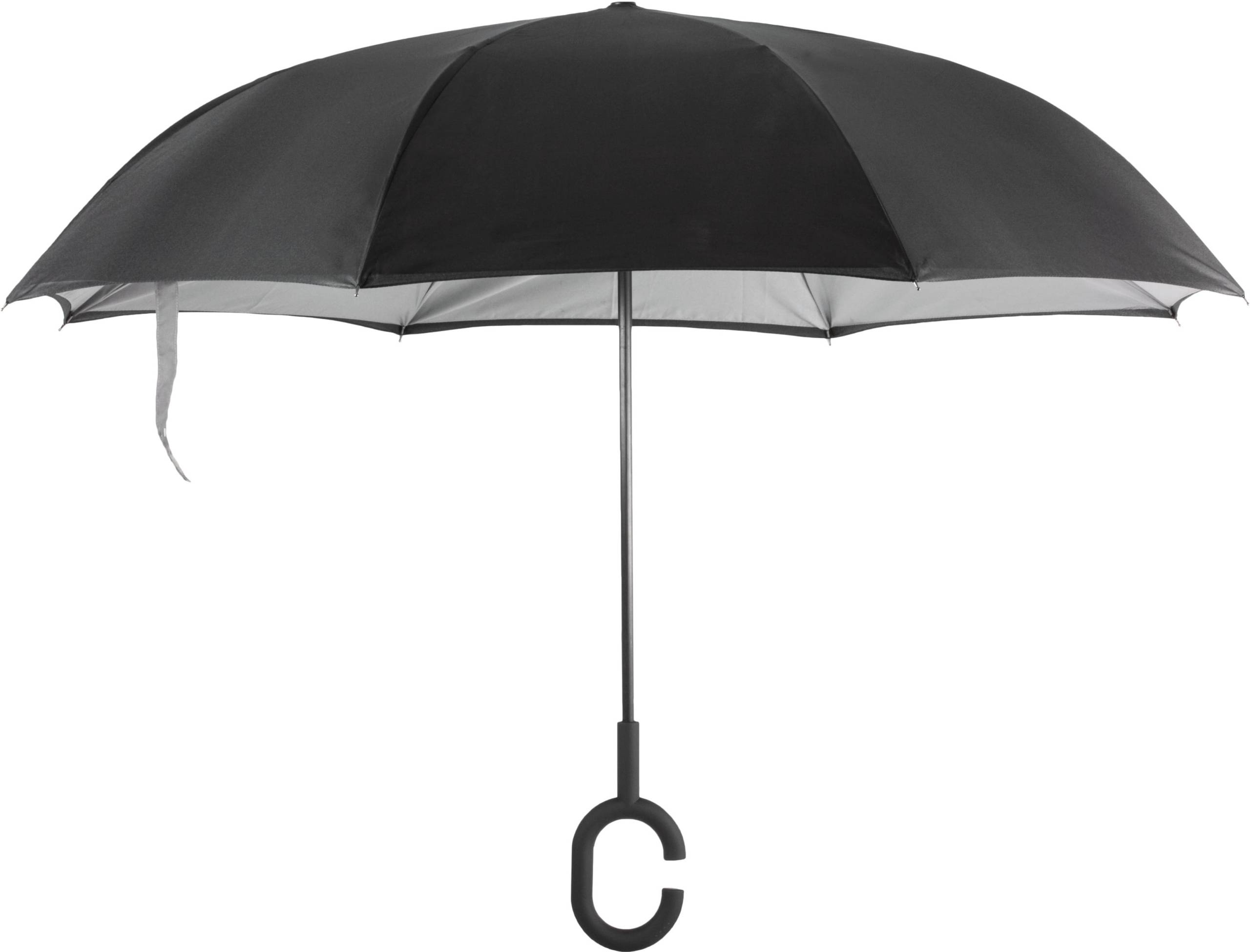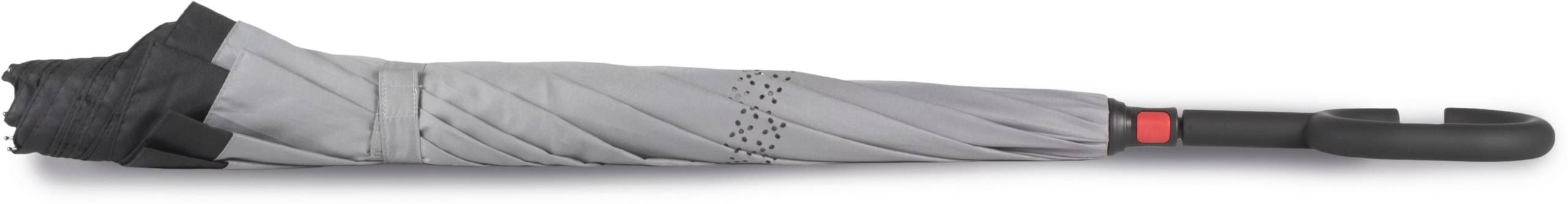 Parapluie avec système d’ouverture manuelle inversé 23′ (diamètre : 108 cm), mât en métal, baleines et embouts de baleines en fibres de verre, poignée mains libres en polycarbonate en forme de C pour accroche au poignet. Toile en pongé de polyester 190T.