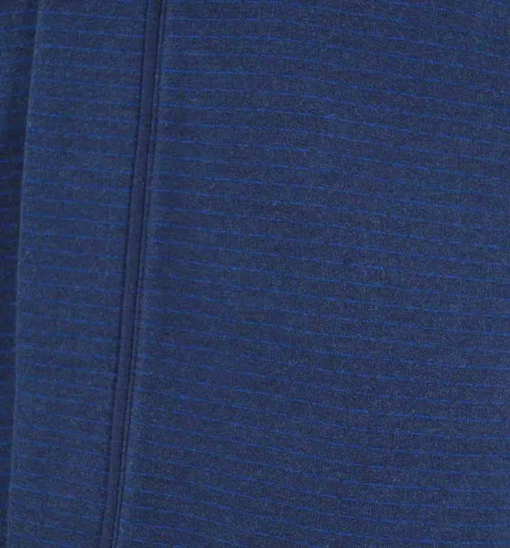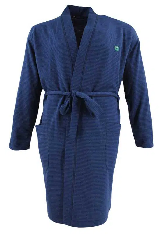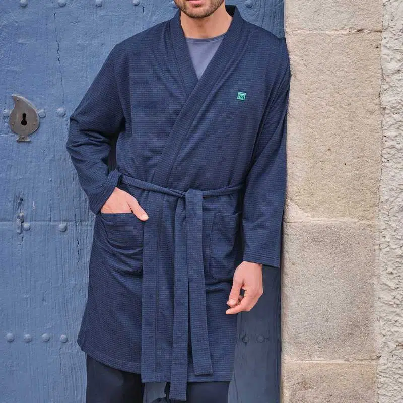 MASSANA vous propose ce long peignoir marine qui arbore de fines rayures bleu ciel. Un peignoir de mi-saison avec son intérieur légèrement molletonné.