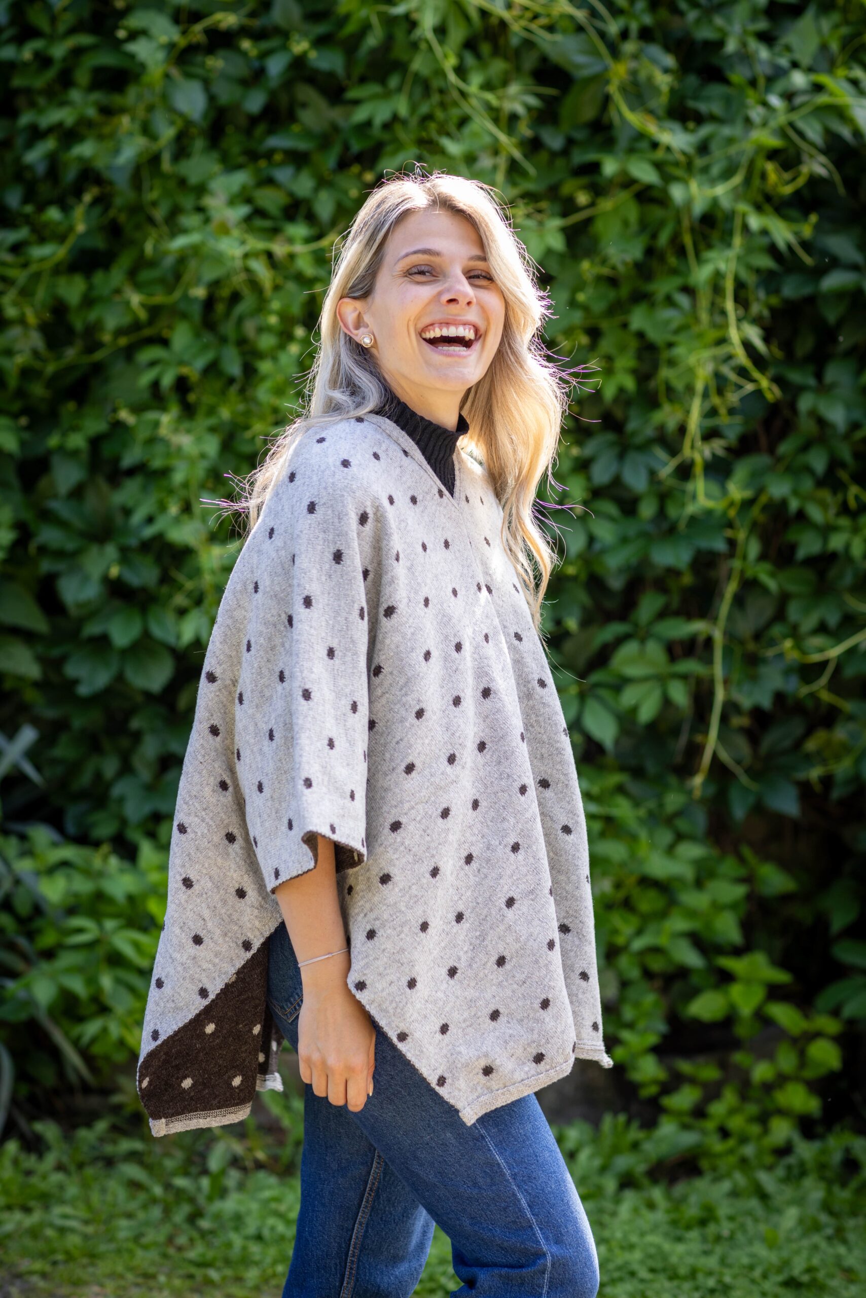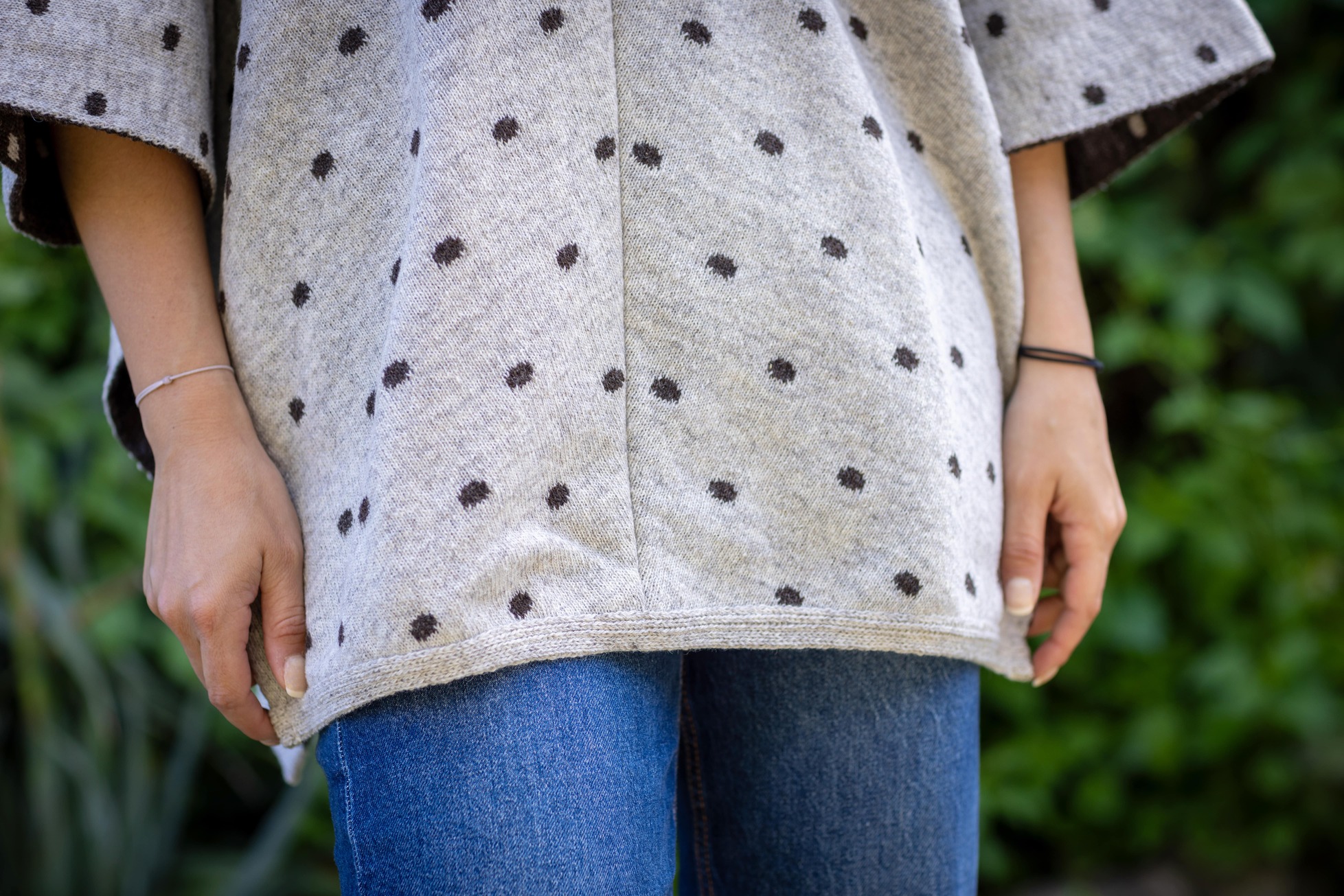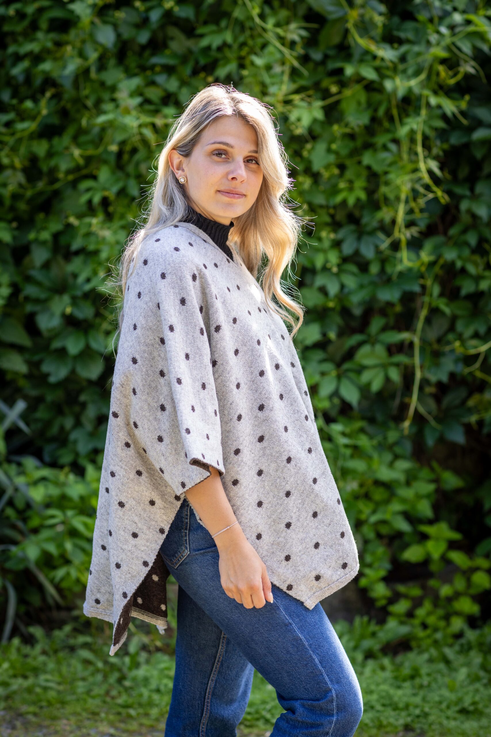 Poncho en laine mérinos pour femme, avec motifs à pois de couleur pour un look fantaisie.