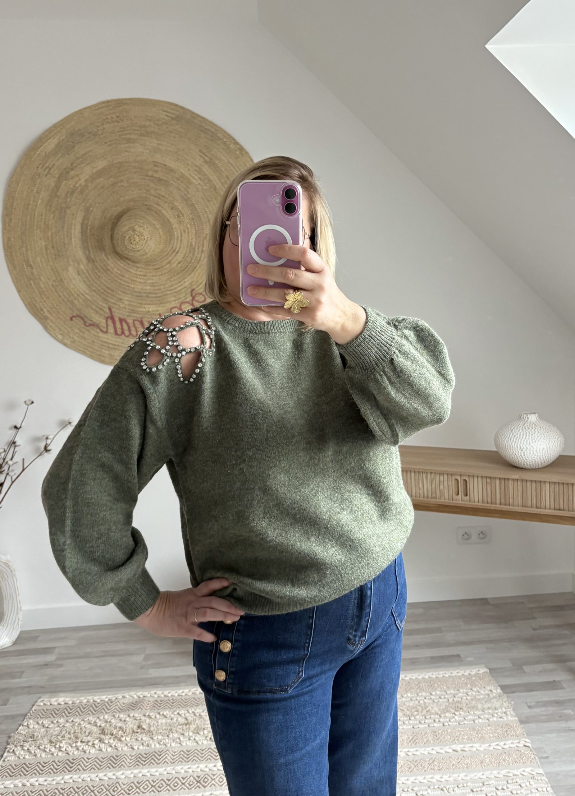 Découvrez le pull oversize femme Scarlett de Milanah. Avec ses détails en strass et sa coupe ample, il conjugue confort et élégance. Disponible en camel ou kaki à 39 €.