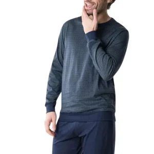 Ce pyjama homme joue sur le contraste du haut uni avec le bas rayé.