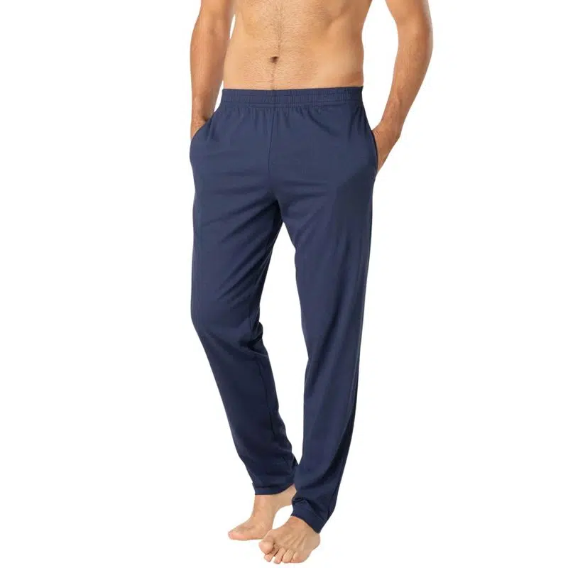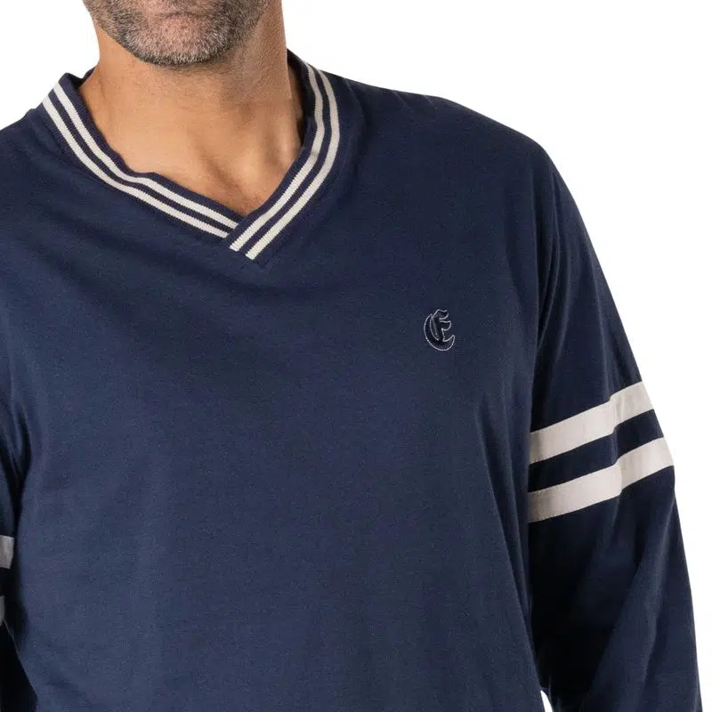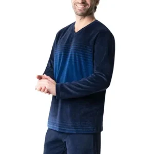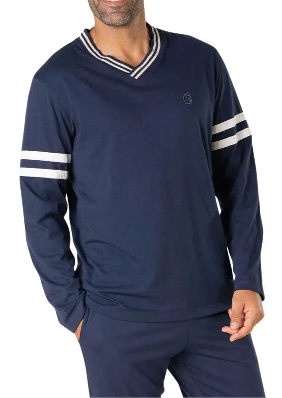 Ce pyjama est réalisé dans un coton peigné, c’est un coton de qualité supérieur car c’est une longue fibre donc plus résistante et plus durable. Ce coton a aussi subi un traitement anti boulochage. Un pyjama bleu avec des bandes contrastée blanches.