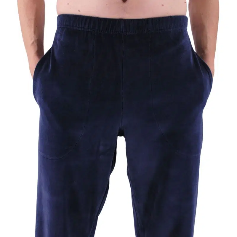 Pantalon avec tissu enveloppant l’élastique. Un pantalon de pyjama avec 2 poches latérales.