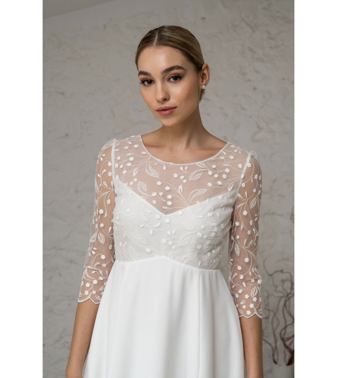 Robe de mariée courte à manches 3/4 en tulle brodé français et en crêpe fluide. Elle comporte une encolure arrondie et un bustier en organza opaque. Le dos est entièrement doublé en organza légèrement transparent et se ferme à l’aide de petits boutons recouverts. Fluide, la jupe est patineuse et virevolte en marchant. Jupe fermeture zippée. Longueur jupe à partir de la découpe côté taille 50cm.