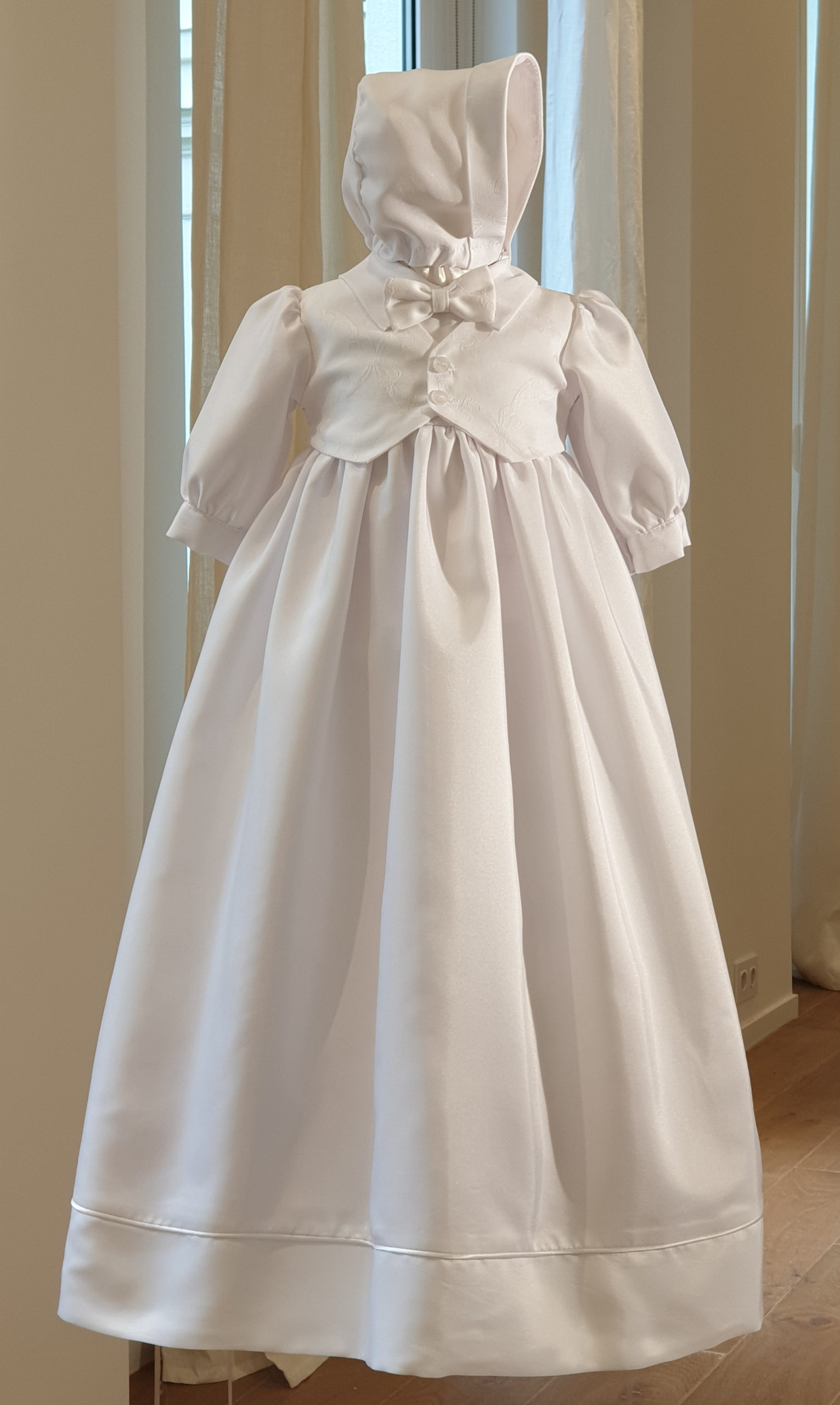 Cette robe de Brit Milah est en ottoman blanc avec un gilet broché blanc et ses noeuds assorti.Elle est doublée en coton et a un chapeau assorti.Elle est fabriquée dans notre atelier parisien et est idéale pour une cérémonie de Brit Milah