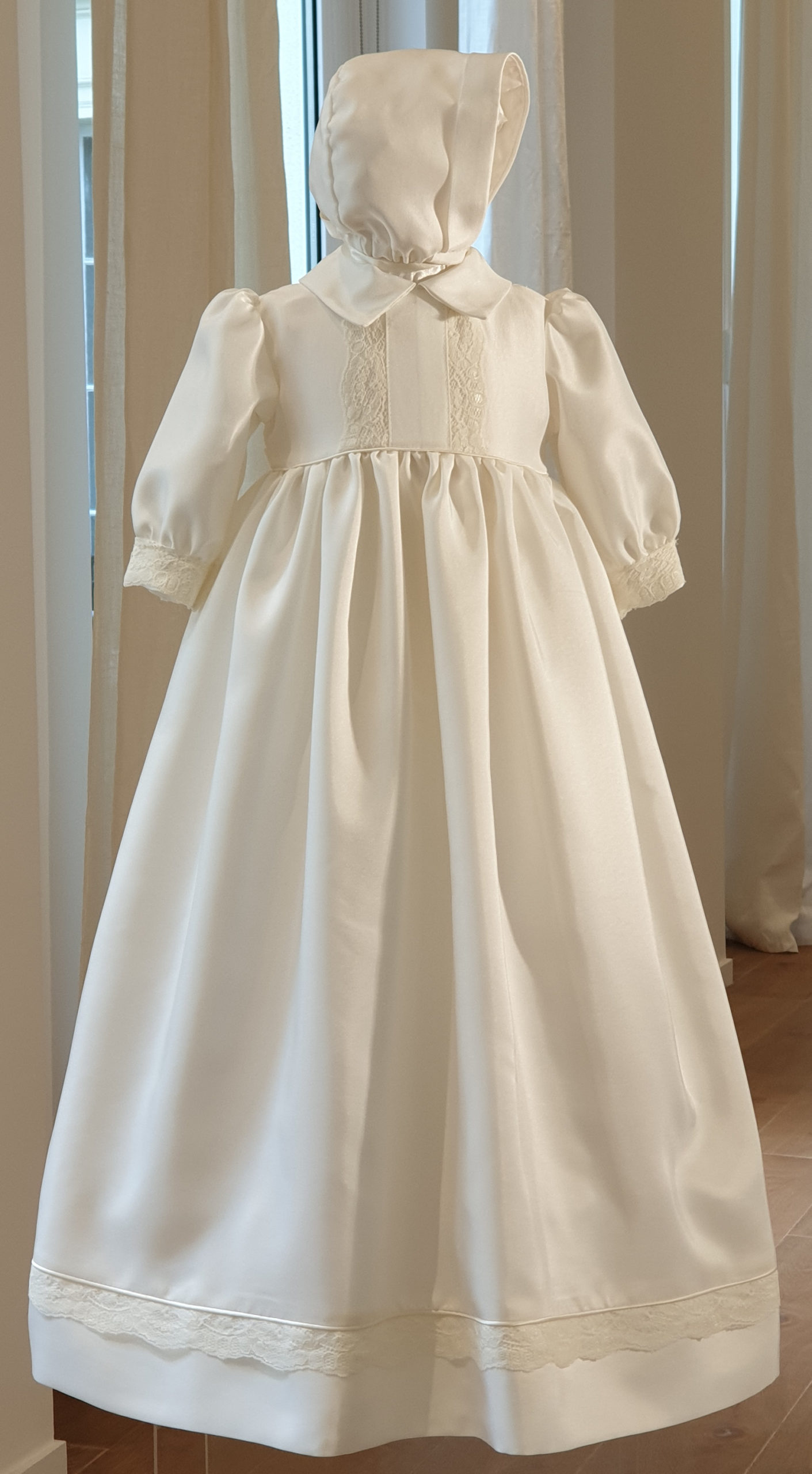 Cette robe de Brti Milah est en ottoman écru avec des incrustations de dentelle, elle est doublé en coton et est fabriquée dans notre atelier parisien et convient pour un brit milah