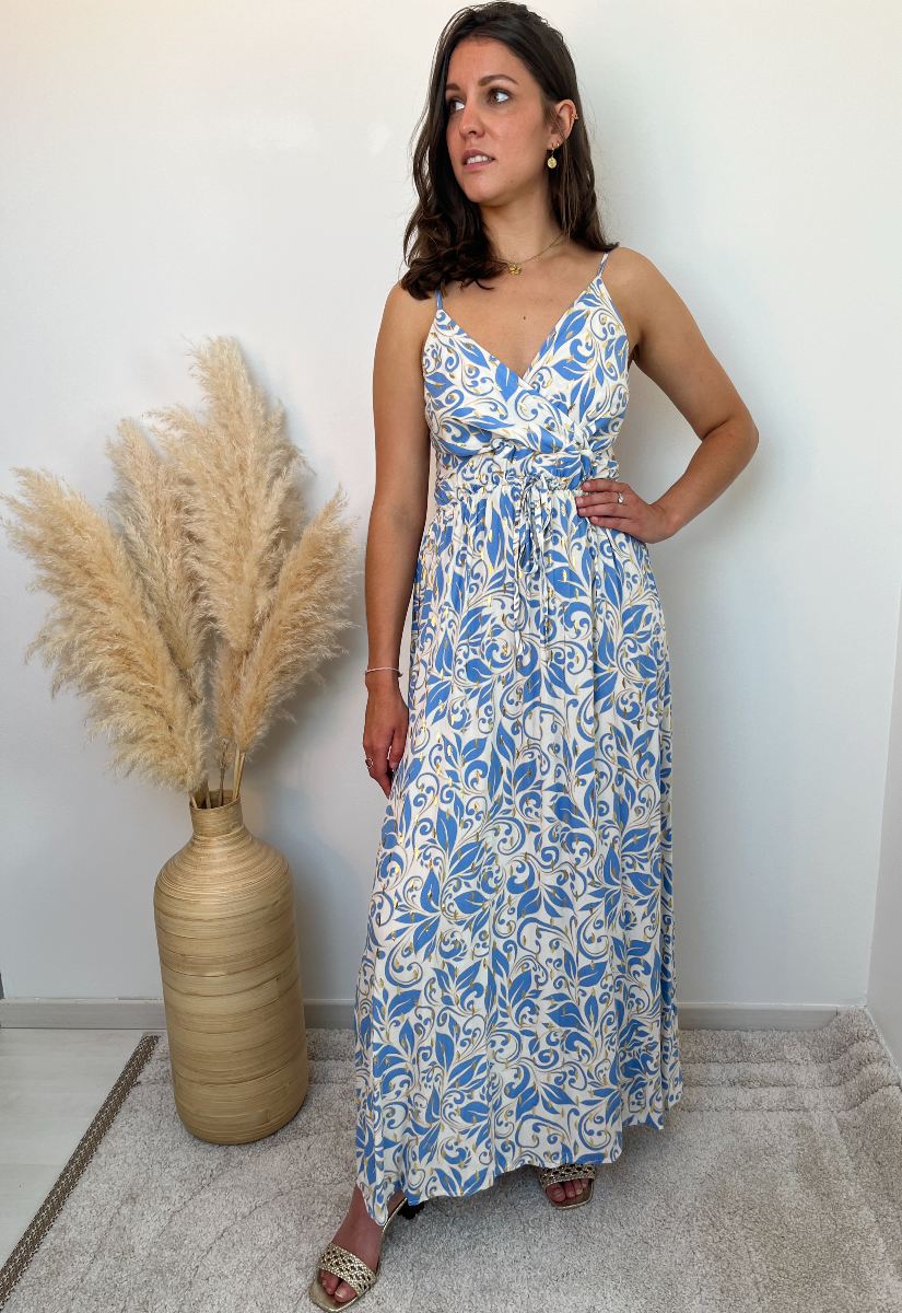 Ajoutez une touche de fraîcheur à votre dressing estival avec cette robe longue fluide à l’imprimé bleu et écru d’inspiration végétale.
