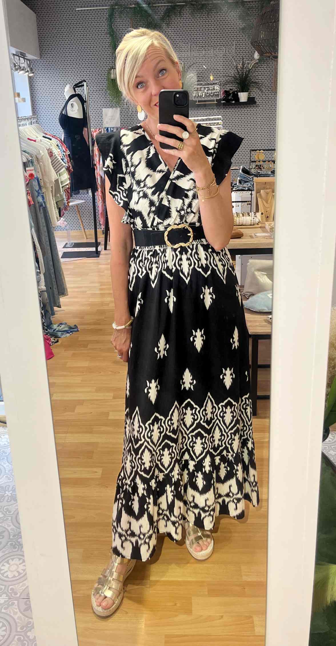 Portez-la avec une ceinture dorée pour souligner la taille (comme sur la photo) et des sandales dorées ou compensées pour allonger la jambe.