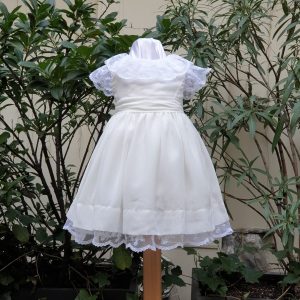Robe Pompadour 145 euro cette robe de BAPTEME est en dentelle de calais écrue doublée en coton à un jupon de tulle sous la robe elle a un gros noeuds dans le dos elle est fabriquée en France dans notre atelier parisien