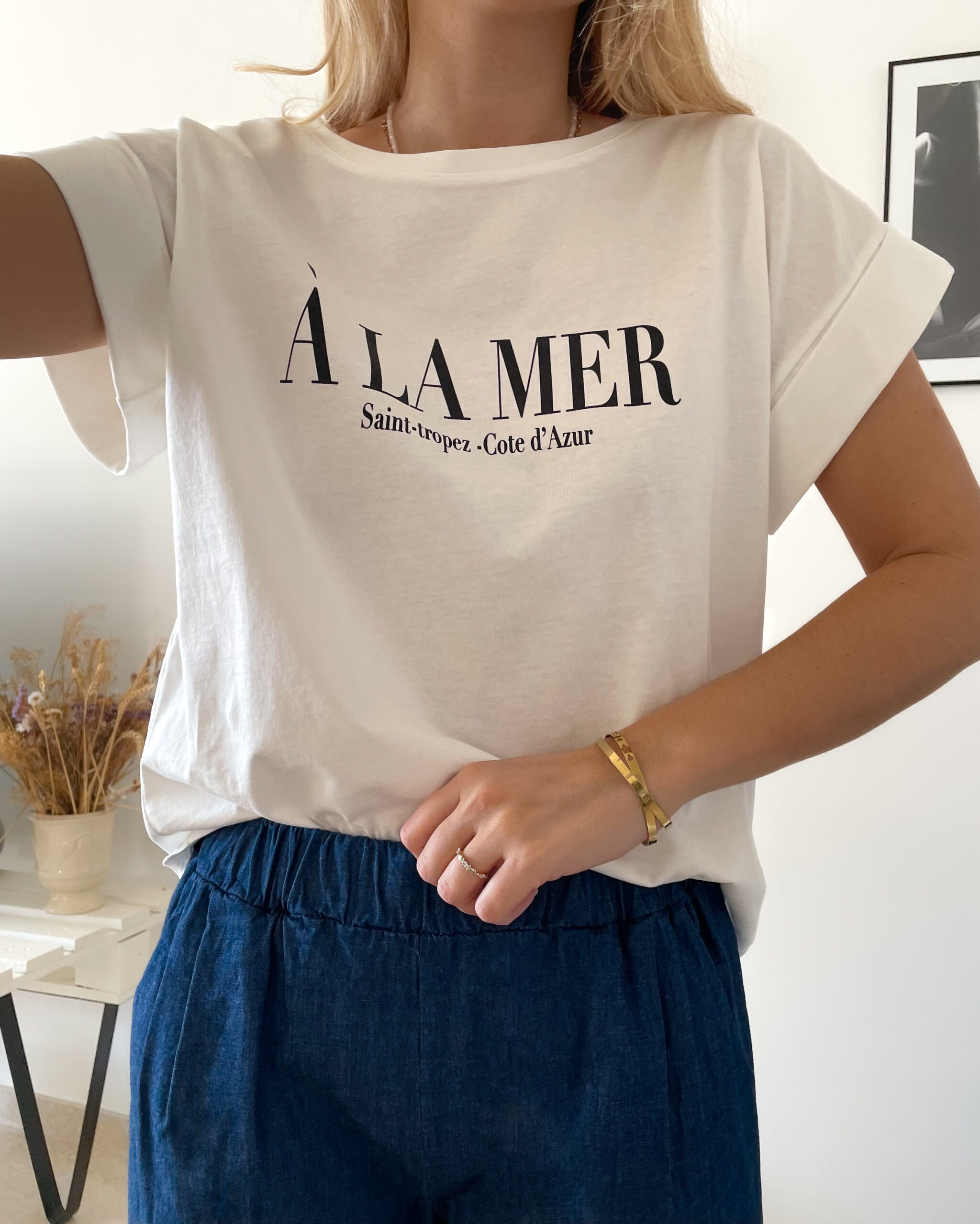 -Le mannequin porte le t-shirt avec le jean fluide brut Maxou.