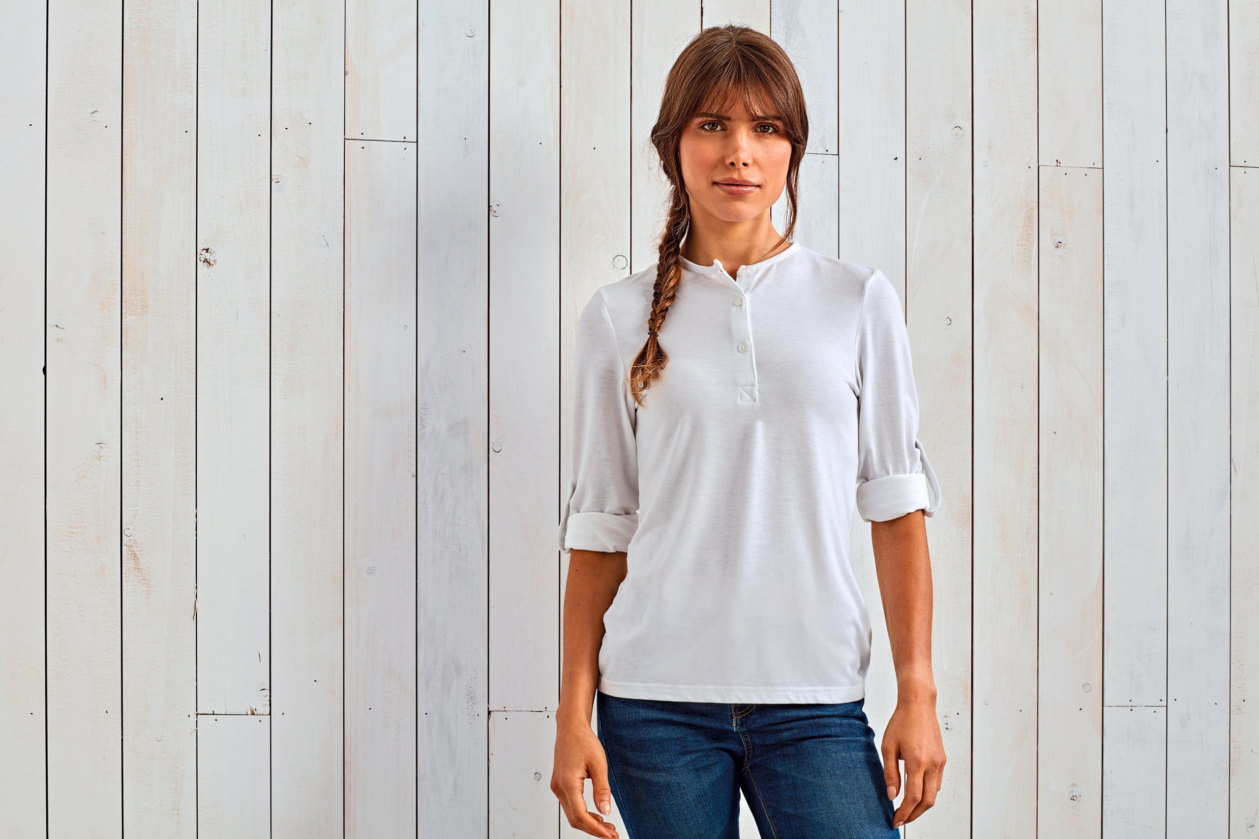 82% polyester / 14% viscose / 4% élasthanne (motif à rayure tissé-teint pour le coloris White/Navy). Sa matière douce et souple en font une alternative confortable à la chemise classique. T-shirt fonctionnel pour un style décontracté : il peut se porter en version manches longues ou bien retroussées grâce à sa patte de boutonnage sur les manches. Col rond avec patte de boutonnage 3 boutons. Bord-côte à l’encolure et au bas des manches.