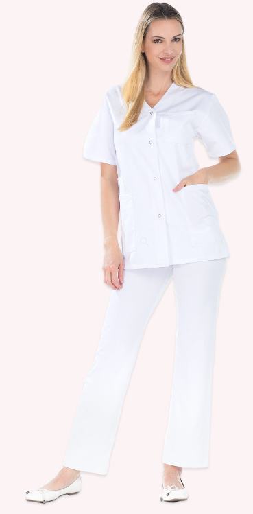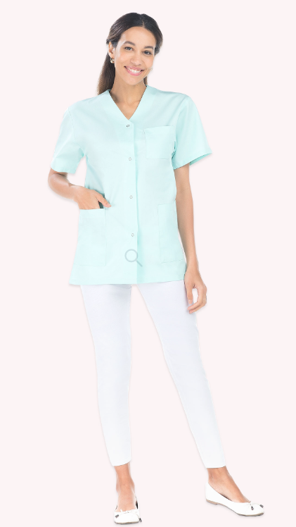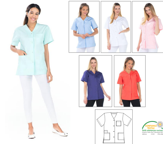 Tunique femme, manches courtes, fermeture par pressions, 2 poches basses, 1 poche BIP, 1 poche poitrine, fentes côtés, longueur 75 cm