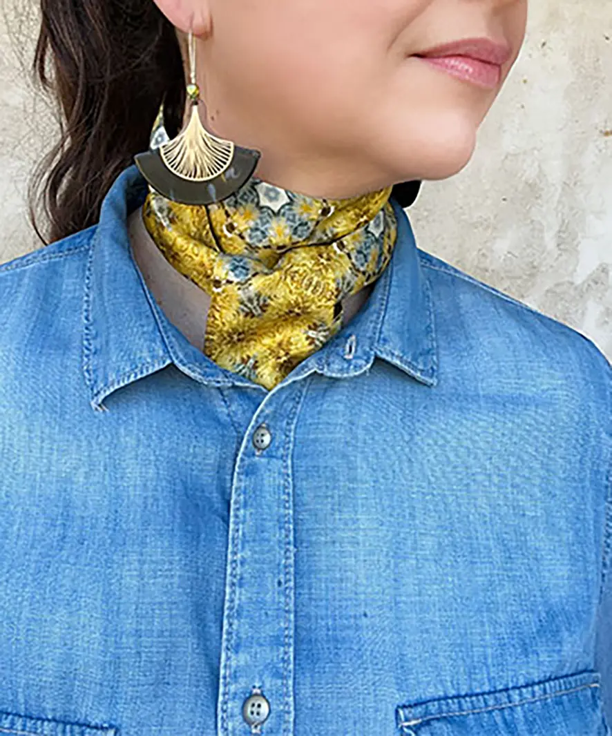 De couleur dominante jaune, son motif est lumineux et ses nuances de bleu gris adoucissent l’ensemble mais permettent également de le coordonner en toutes saisons, avec des tons en camel, beige ou encore des bleus et des gris.