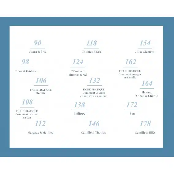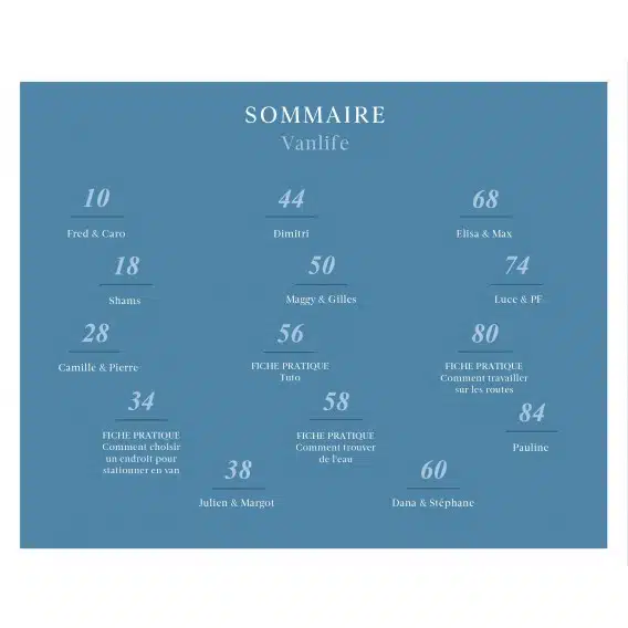 Découvrez les portraits de ces nouveaux nomades qui partagent avec nous leurs motivations, leurs modes de vie, leurs anecdotes de voyage et leurs conseils. Grâce aux magnifiques photos, vous pourrez découvrir l’aménagement des différents van tous plus originaux les uns que les autres et vous plonger dans les paysages grandioses que ces voyageurs ont traversés.