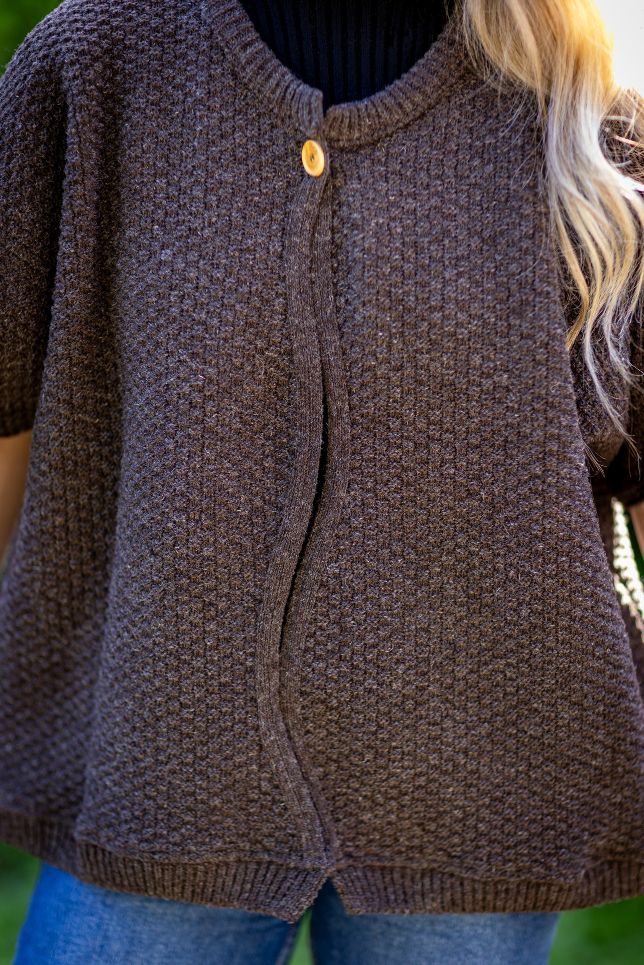 Ce petit bolero sans manches est un ajout élégant et original à votre garde-robe. Le petit bouton permet de maintenir le gilet en forme, tandis que l’ouverture se termine par une petite bande arrondie comme une petite vague. La maille n’est pas épaisse et très fantaisie, offrant une touche unique et sophistiquée.