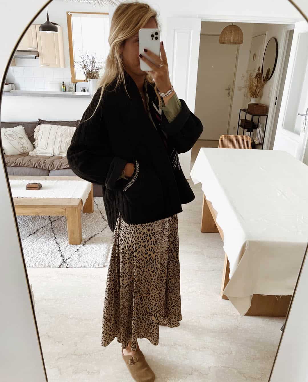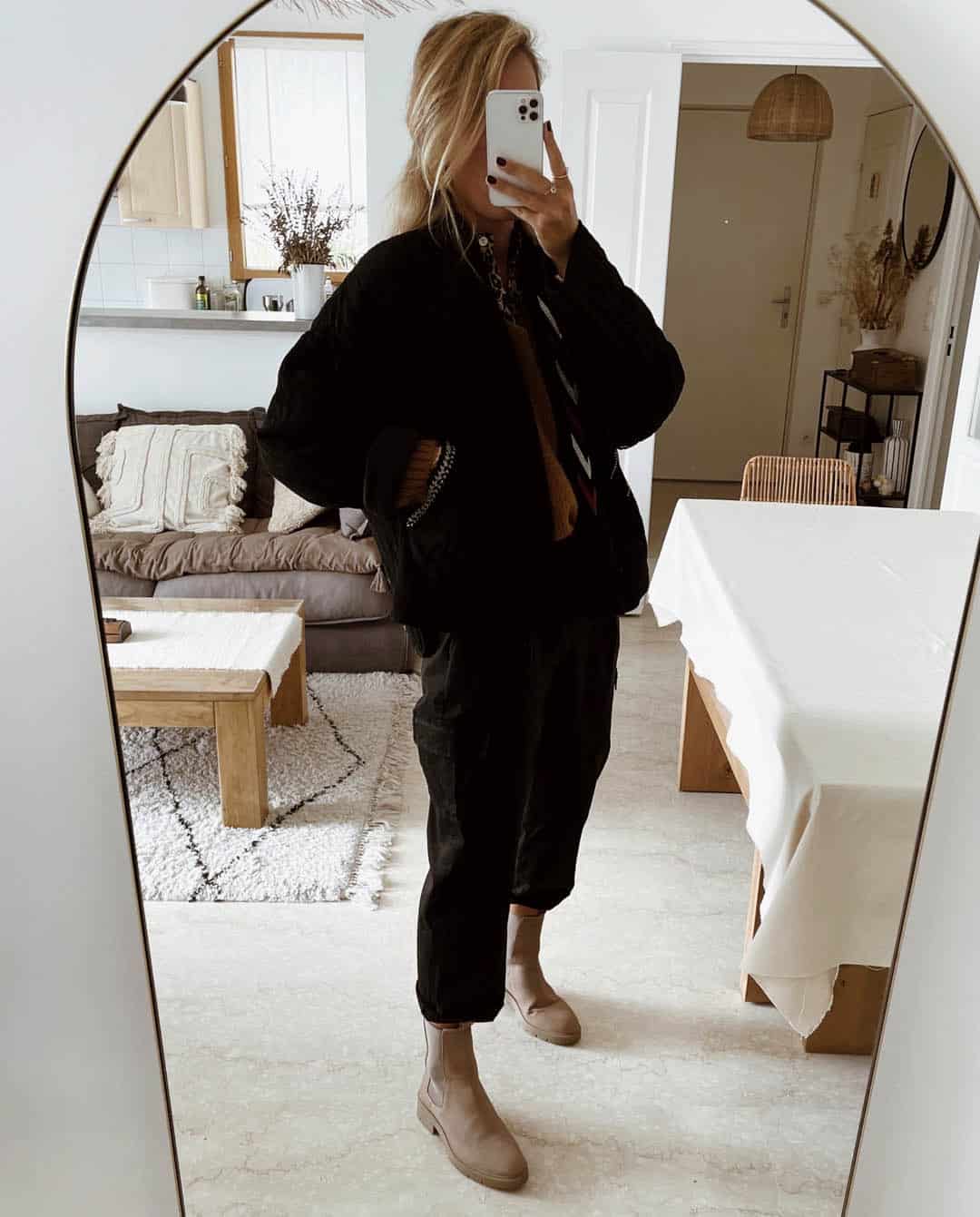 -Le mannequin mesure 1m74 et porte la Veste Manches Longues Brodée Noir Julia avec le pull camel Manon. On peut l’ajouter avec le Pantalon Cargo noir Axel.