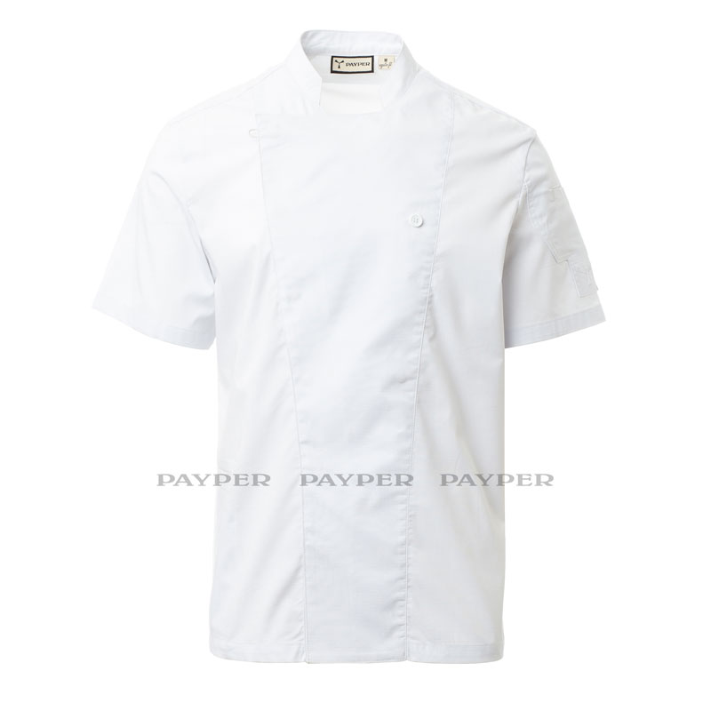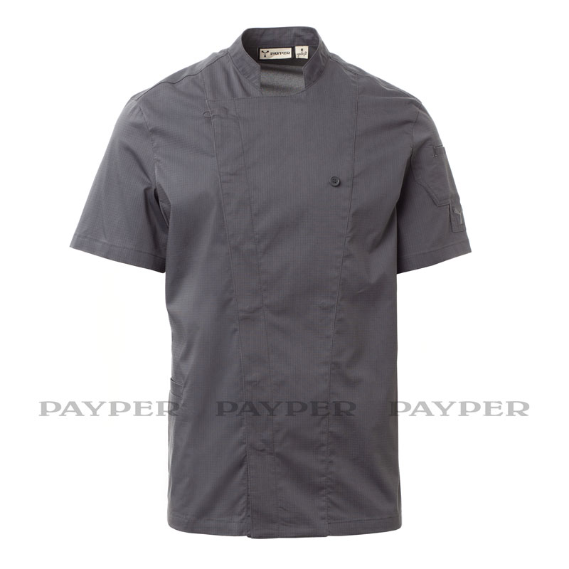 Veste de cuisine homme à col mao, réalisée en ripstop de coton et Lycra® T400®, avec d’excellentes propriétés élastiques et respirantes, et avec un tissu mesh confortable sur le dos et les emmanchures, pour amplifier la respirabilité.