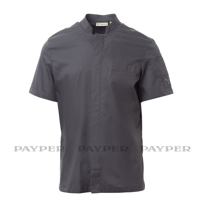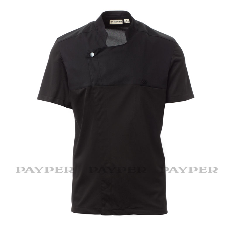 Veste de cuisine homme à col mao, réalisée en twill de coton et Lycra® T400®, avec d’excellentes propriétés élastiques et respirantes, et avec un tissu en mesh confortable sur le dos, les manches et la taille, pour permettre une respirabilité maximale.